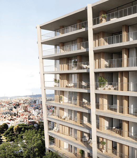 With its clean lines, minimalistic façade, subtly inclined to maximise light and panoramic views, BONSANT establishes a new standard for urban living in Lisbon. Inside, open-plan layouts, expansive windows and high-quality finishes in natural wood and stone create homes that feel both elegant and inviting. Whether you are a professional, a family or an investor, BONSANT promises a lifestyle where design meets comfort and convenience.