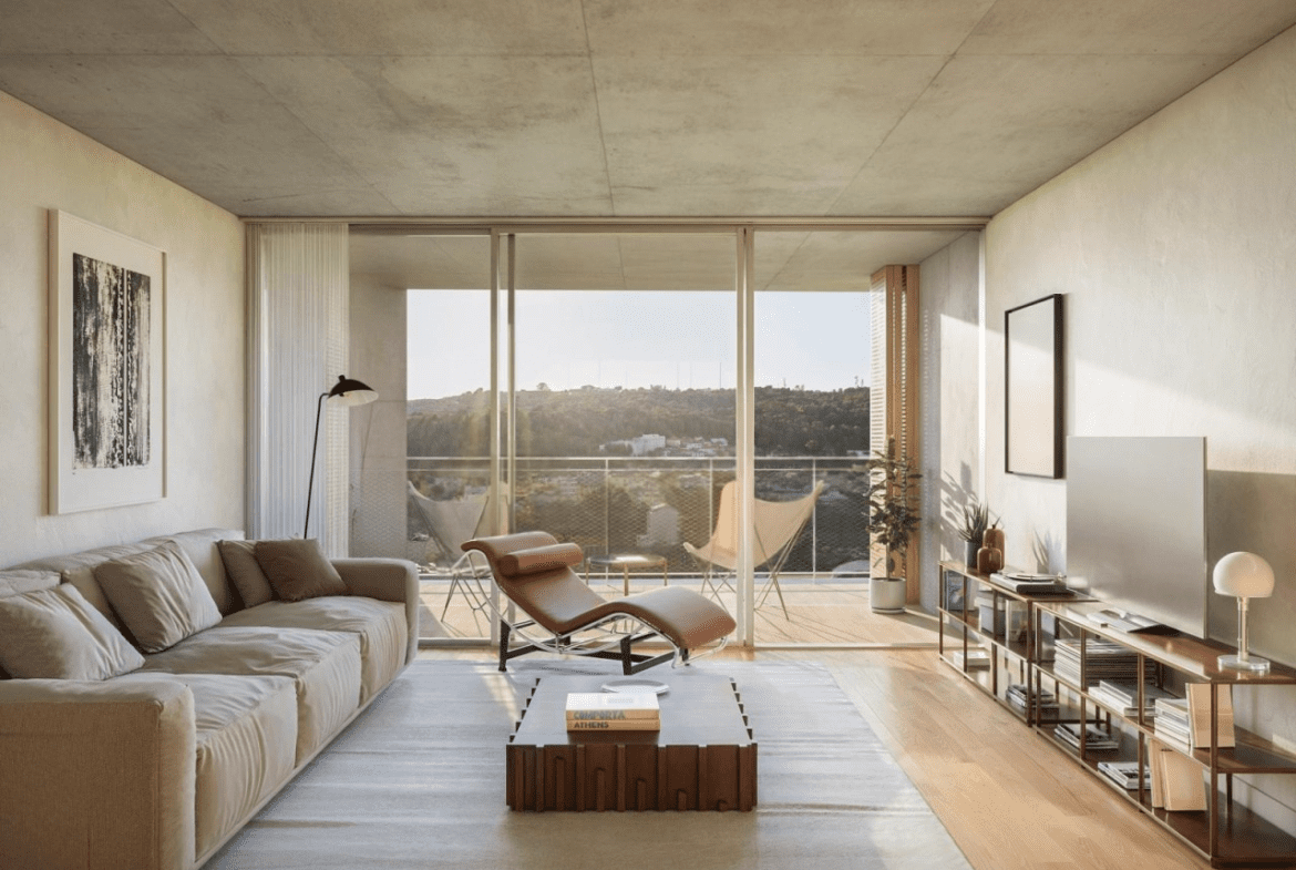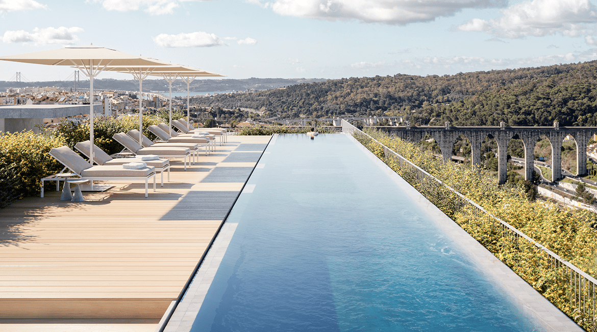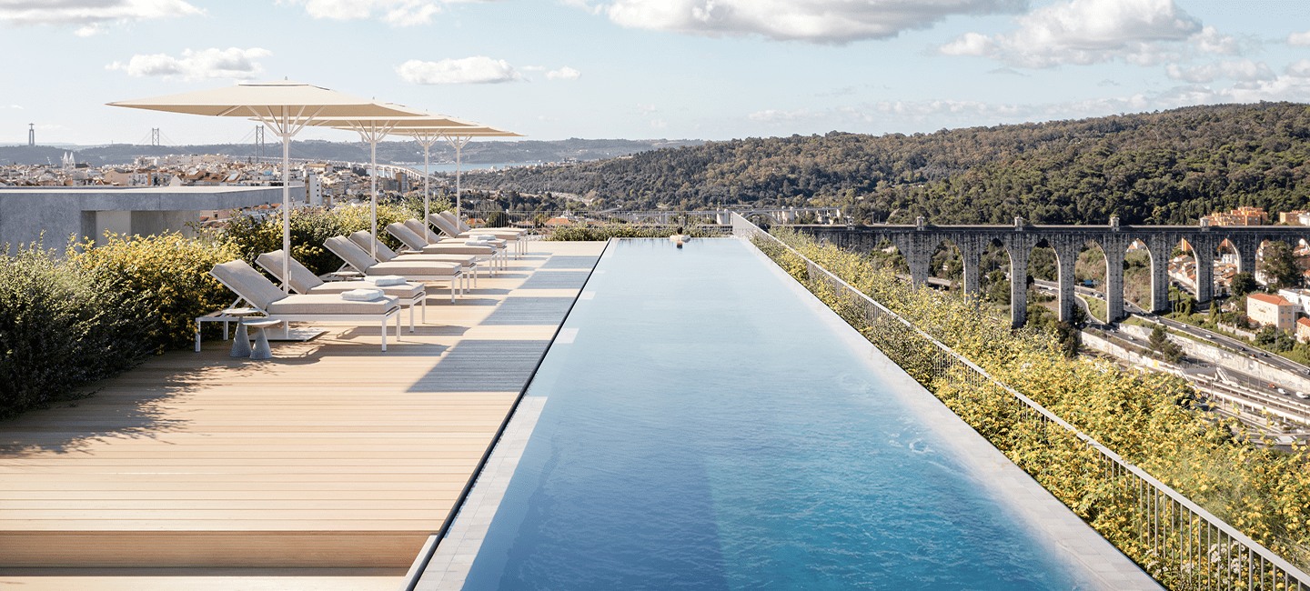 Modern T1–T3 apartments at BONSANT, Lisbon. Rooftop pool, spa, gym and green views in Campolide. Urban elegance meets nature.