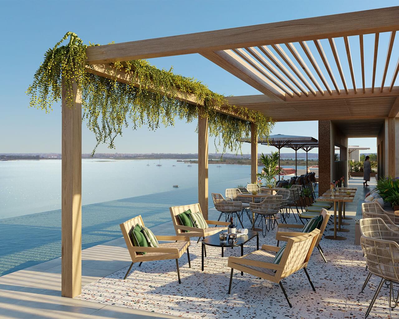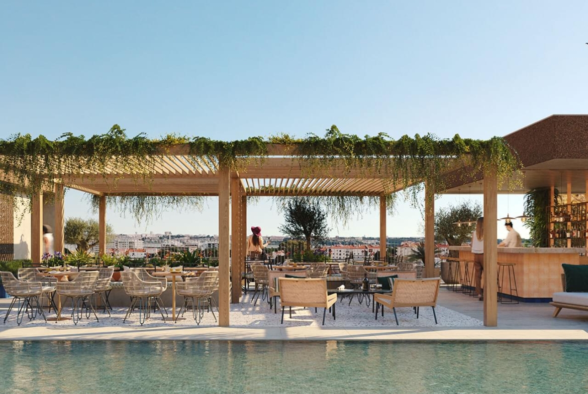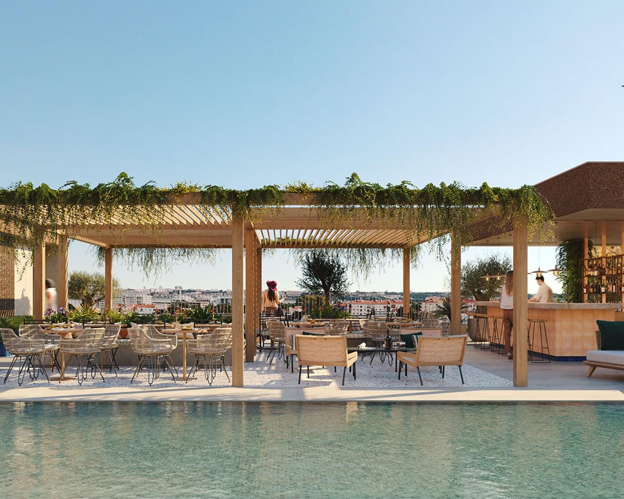 - Panoramic rooftop pool and bar overlooking the Tagus