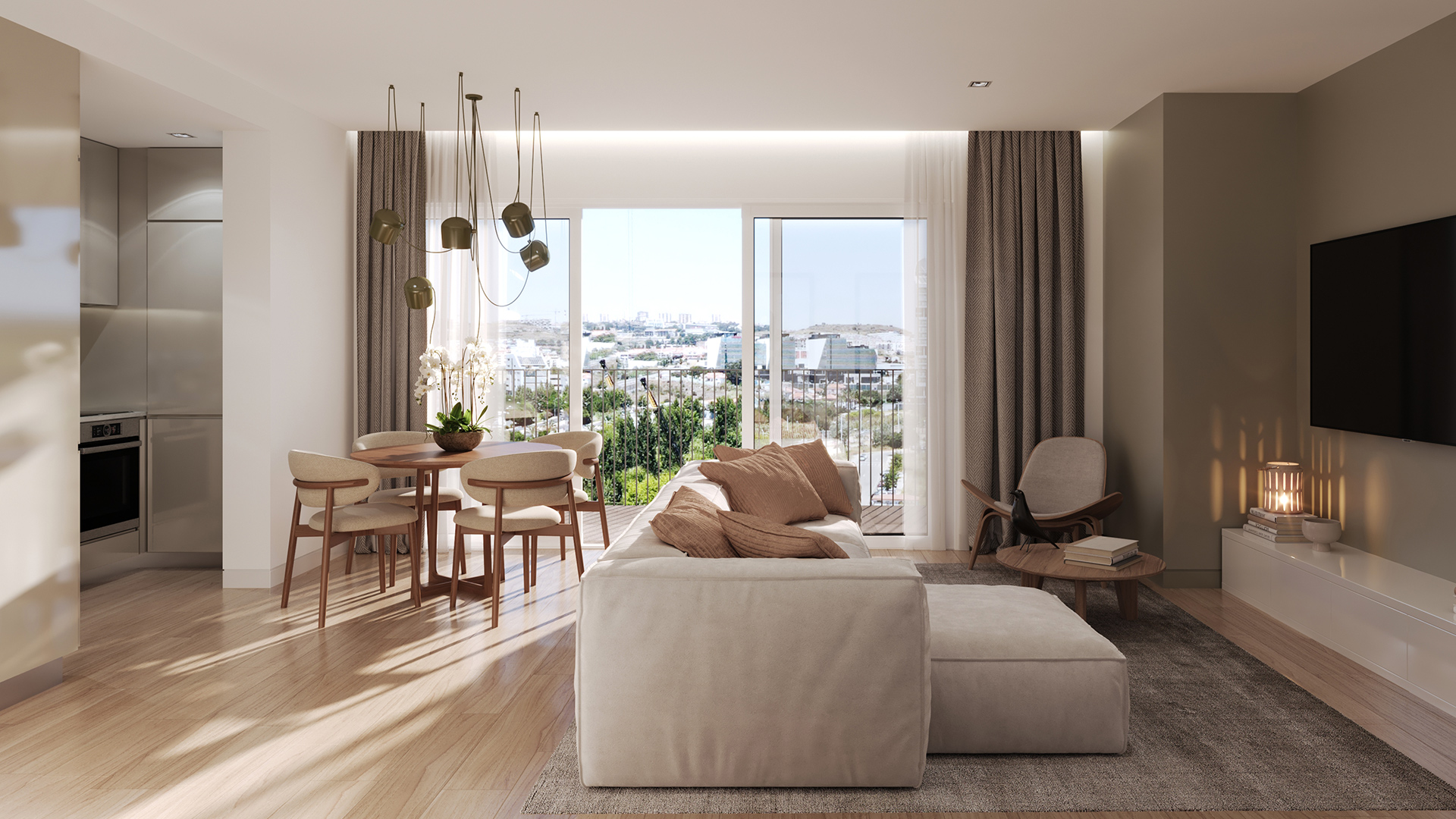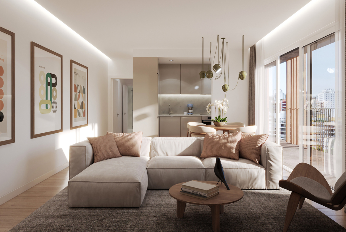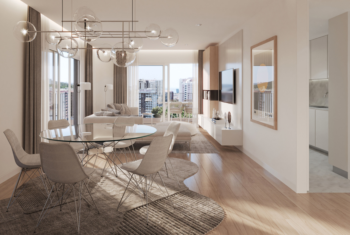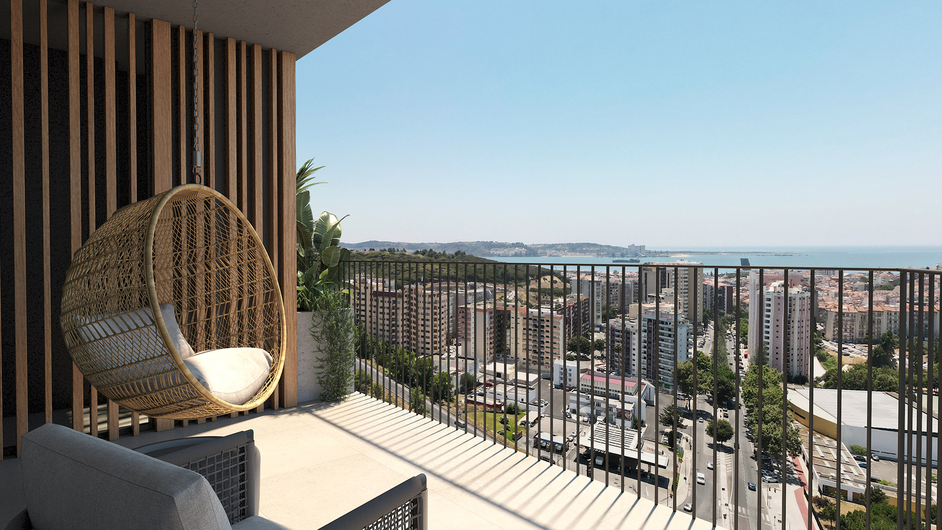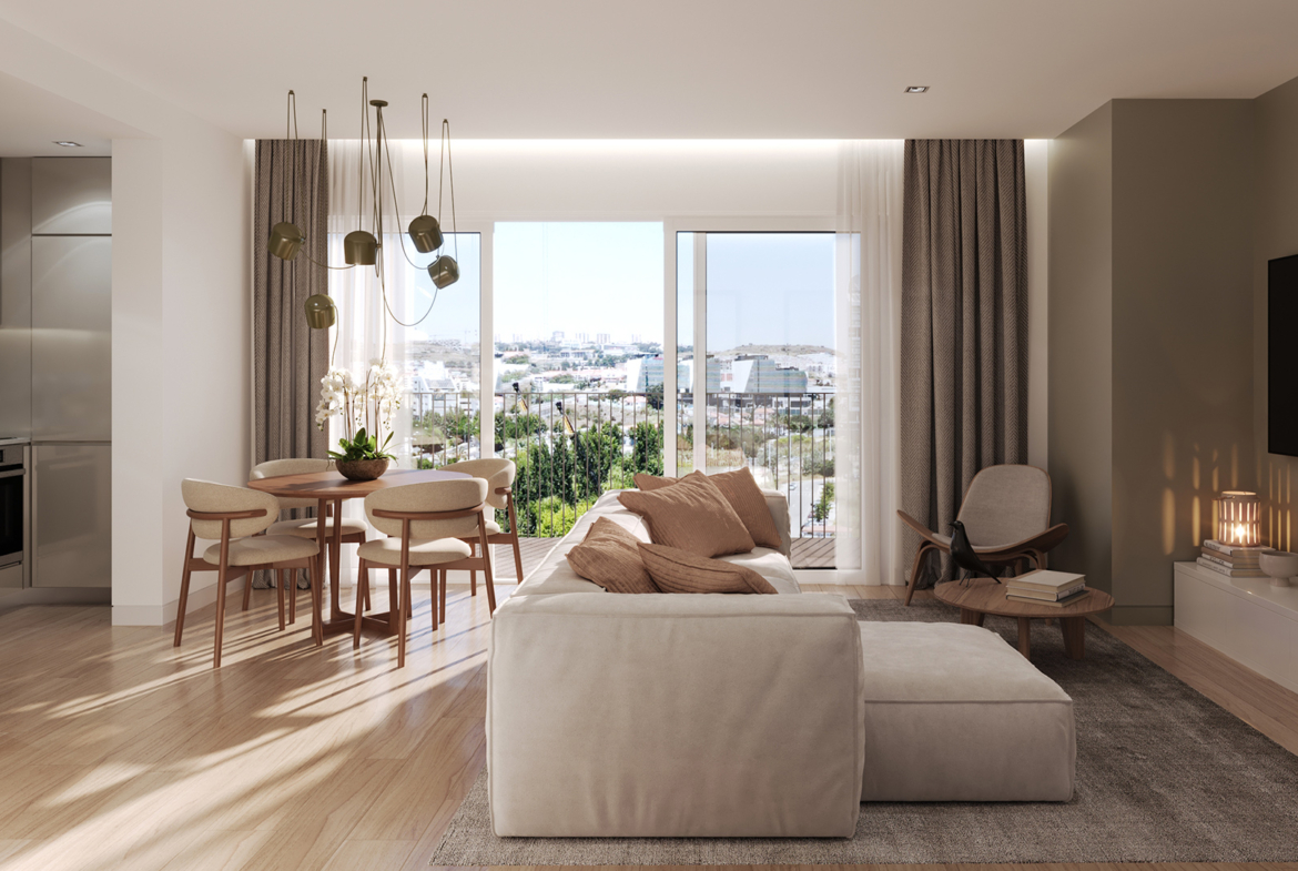ZUME Flats is a contemporary residential development located in Miraflores, Oeiras, comprising 129 fully equipped apartments spread across three buildings. The apartments range from one to four bedrooms (T1 to T4), with areas between 63 m² and 138 m². Designed with contemporary lines and high-quality finishes, each unit features large balconies that offer expansive views of the Tagus River, Monsanto Park, and Miraflores Urban Park, seamlessly integrating nature into urban living.