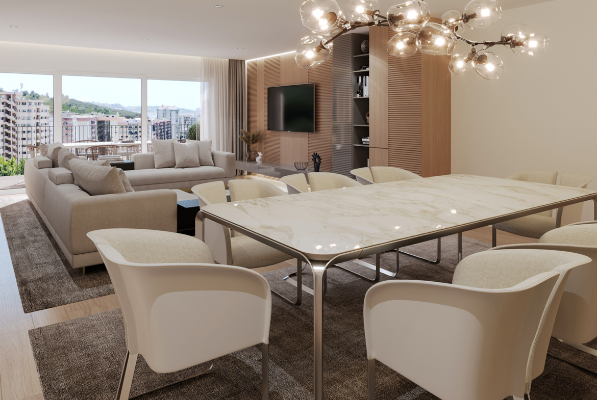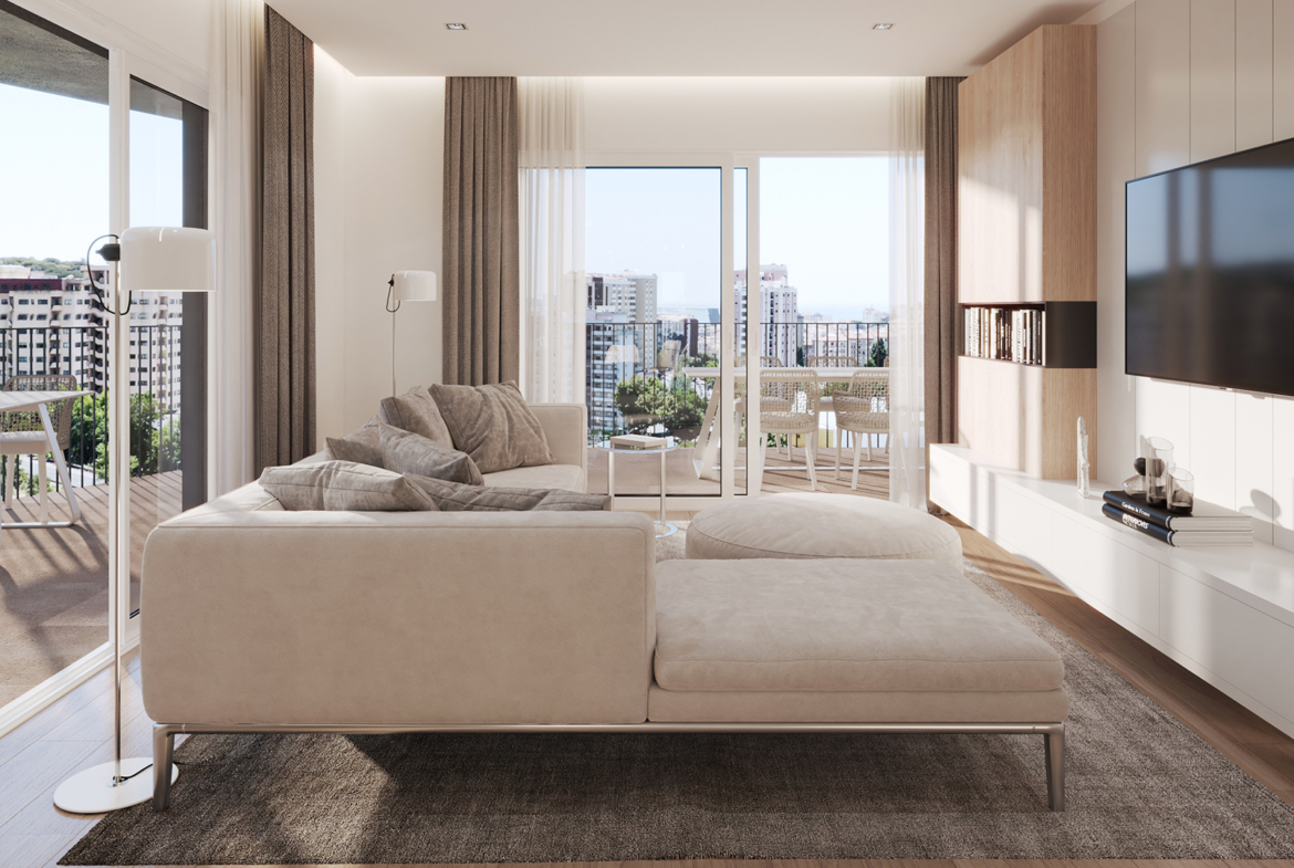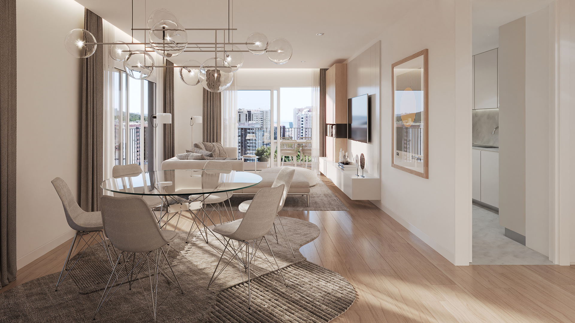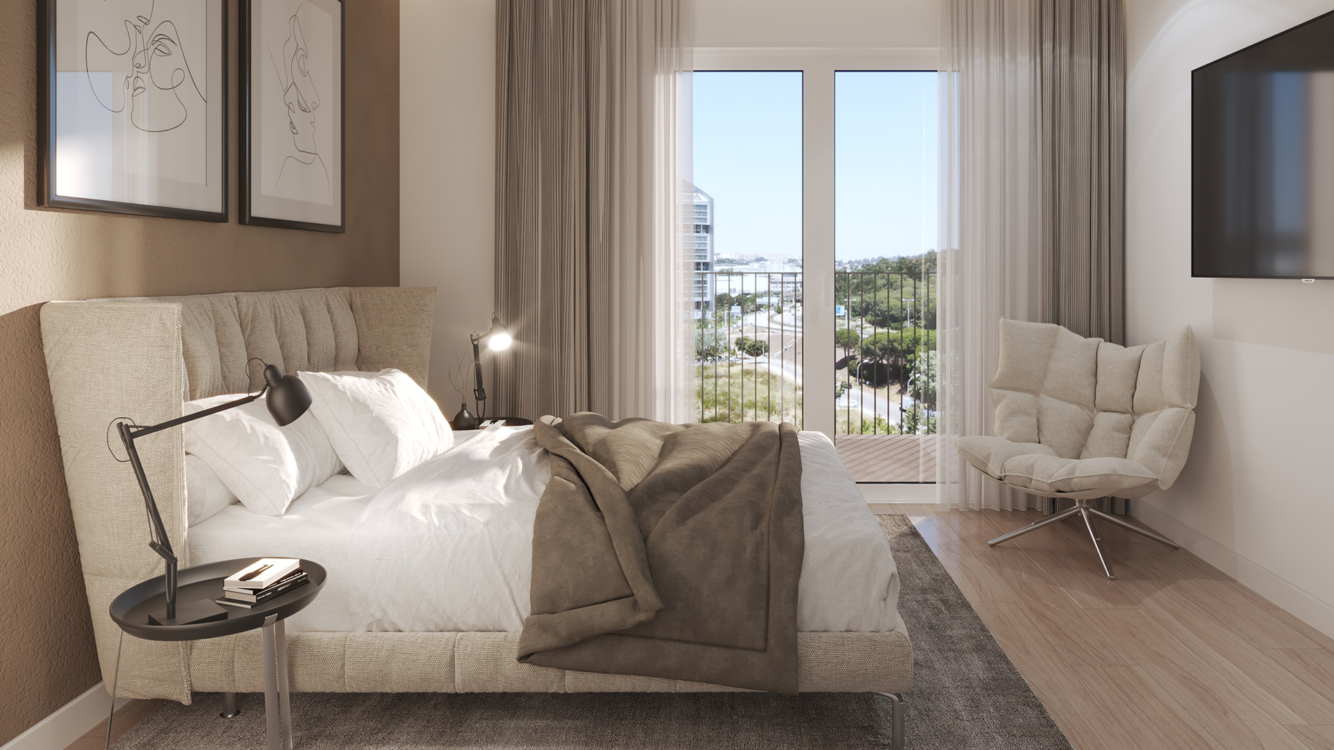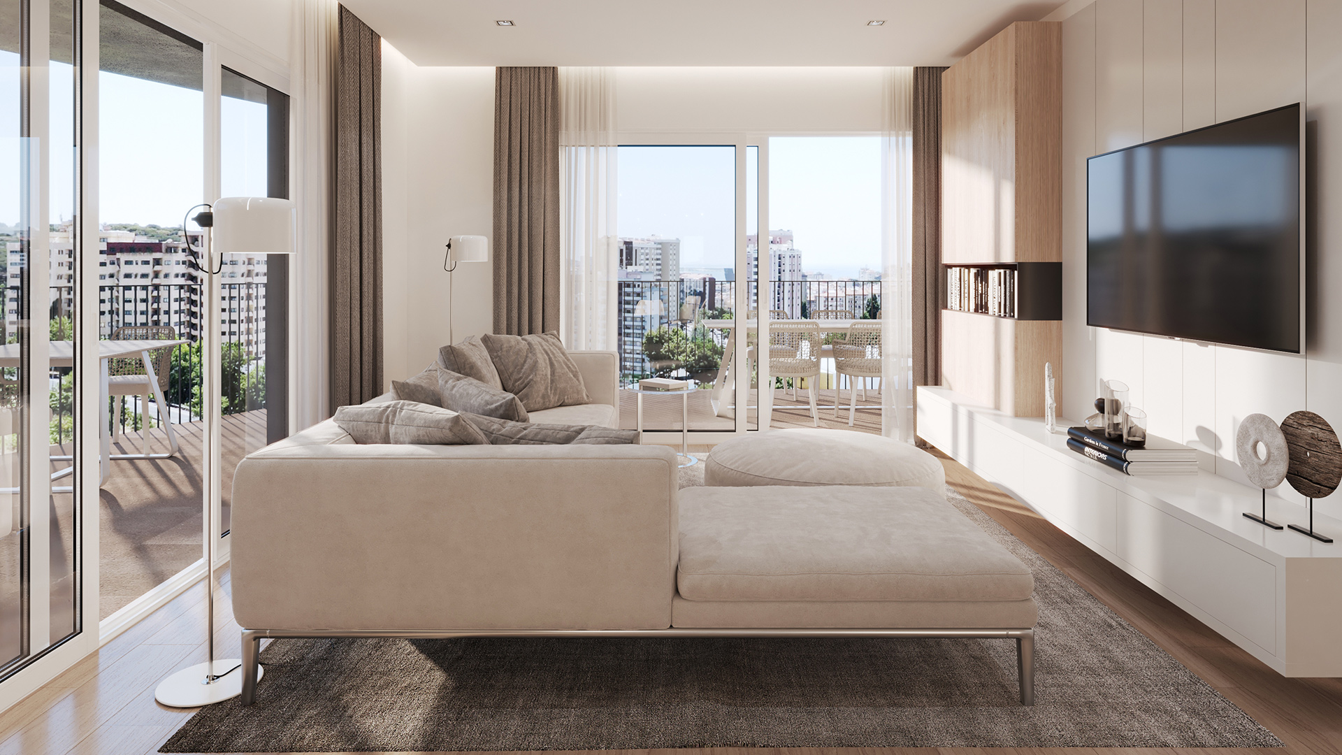 ZUME Flats is a contemporary residential development located in Miraflores, Oeiras, comprising 129 fully equipped apartments spread across three buildings. The apartments range from one to four bedrooms (T1 to T4), with areas between 63 m² and 138 m². Designed with contemporary lines and high-quality finishes, each unit features large balconies that offer expansive views of the Tagus River, Monsanto Park, and Miraflores Urban Park, seamlessly integrating nature into urban living.